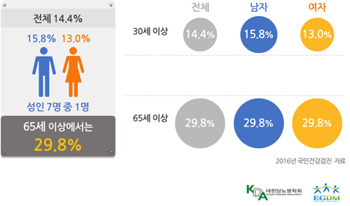 ³ªÀ̰¡ µé¼ö·Ï ÃéÀå¿¡¼ Àν¶¸°À» ºÐºñÇÏ´Â ±â´ÉÀÌ Á¡Â÷ ¶³¾îÁö°í, ¸ö¼Ó¿¡ µé¾î¿Â Æ÷µµ´çÀ» ÀÌ¿ëÇÏ´Â ´É·Âµµ °¨¼ÒÇϹǷΠûÀå³âÃþ¿¡ ºñÇÏ¿© ³ëÀο¡¼´Â ´ç´¢º´ÀÌ ´õ¿í Àß ¹ß»ýÇÕ´Ï´Ù. 65¼¼ÀÌ»ó ³ëÀÎÀÇ 29.8%¿¡¼ ´ç´¢º´ À¯º´À²À» º¸ÀÔ´Ï´Ù.